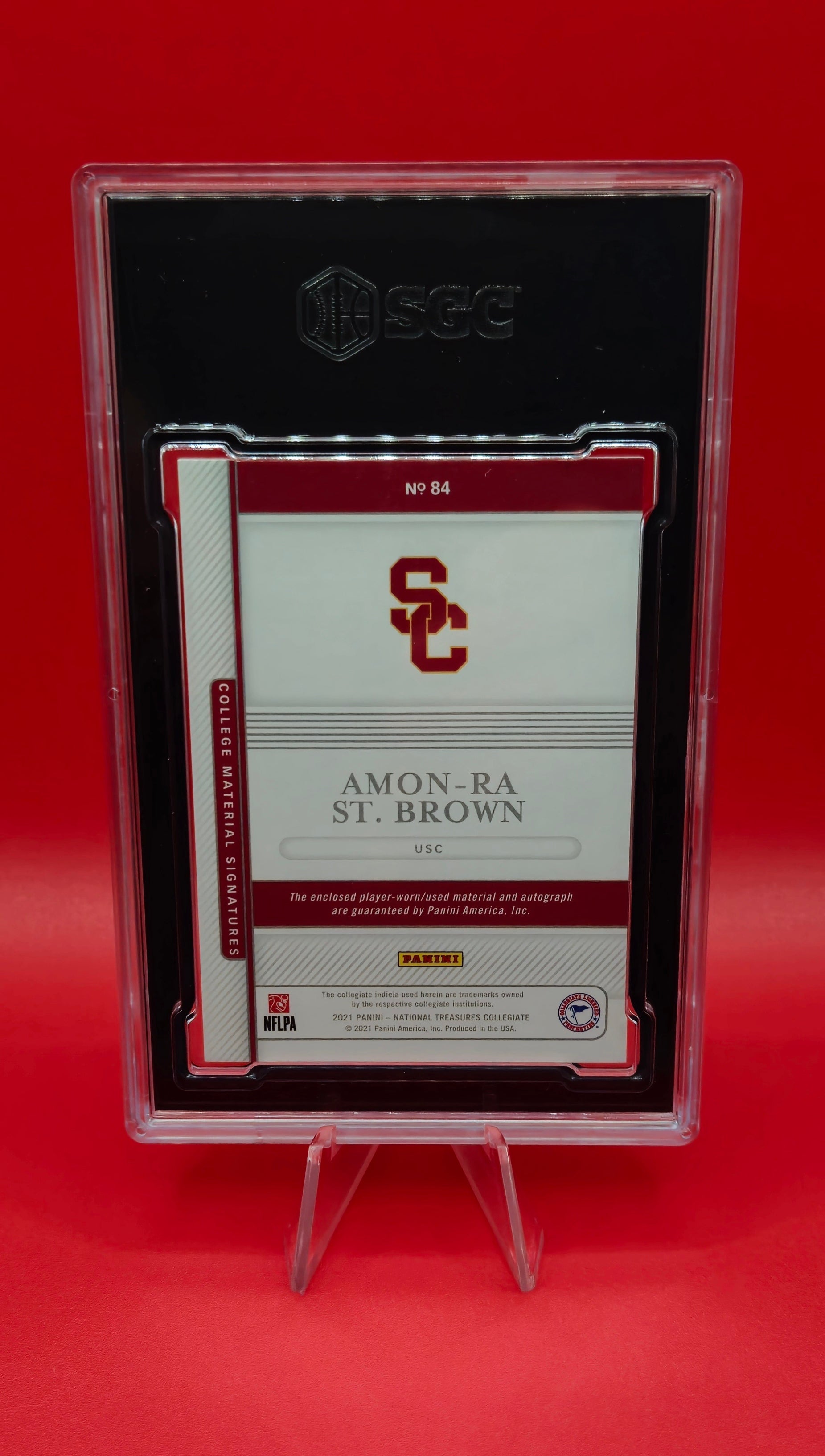 Catch the excitement with this 2021 Panini National Treasure Amon-Ra St. Brown RPA 38/99 #84! 🌟 Showcasing the USC Trojans' star wide receiver turned Detroit Lions 🦁 playmaker, this limited-edition card (only 99 made) is a must-have for fans and collectors alike. Add this prized piece to your collection and celebrate his rising NFL journey! 🏈🔥
