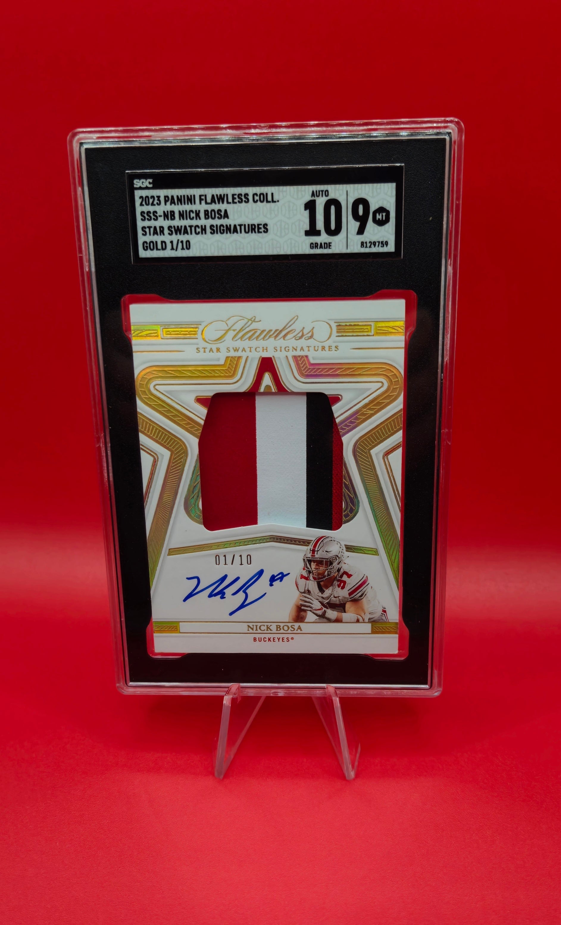Get your hands on the 2023 Panini Flawless Coll. Star Swatch Signatures Gold #SSS-NB featuring Nick Bosa ⚡️! This ultra-rare gem, numbered just 01/10, shines with a dazzling gold autograph and exclusive swatch 🔥. Perfect for any 49ers 🏈 fan looking to score a legendary collectible that’s truly one-of-a-kind 🌟! Don’t miss out on adding this superstar’s signature to your treasure trove 🎉.