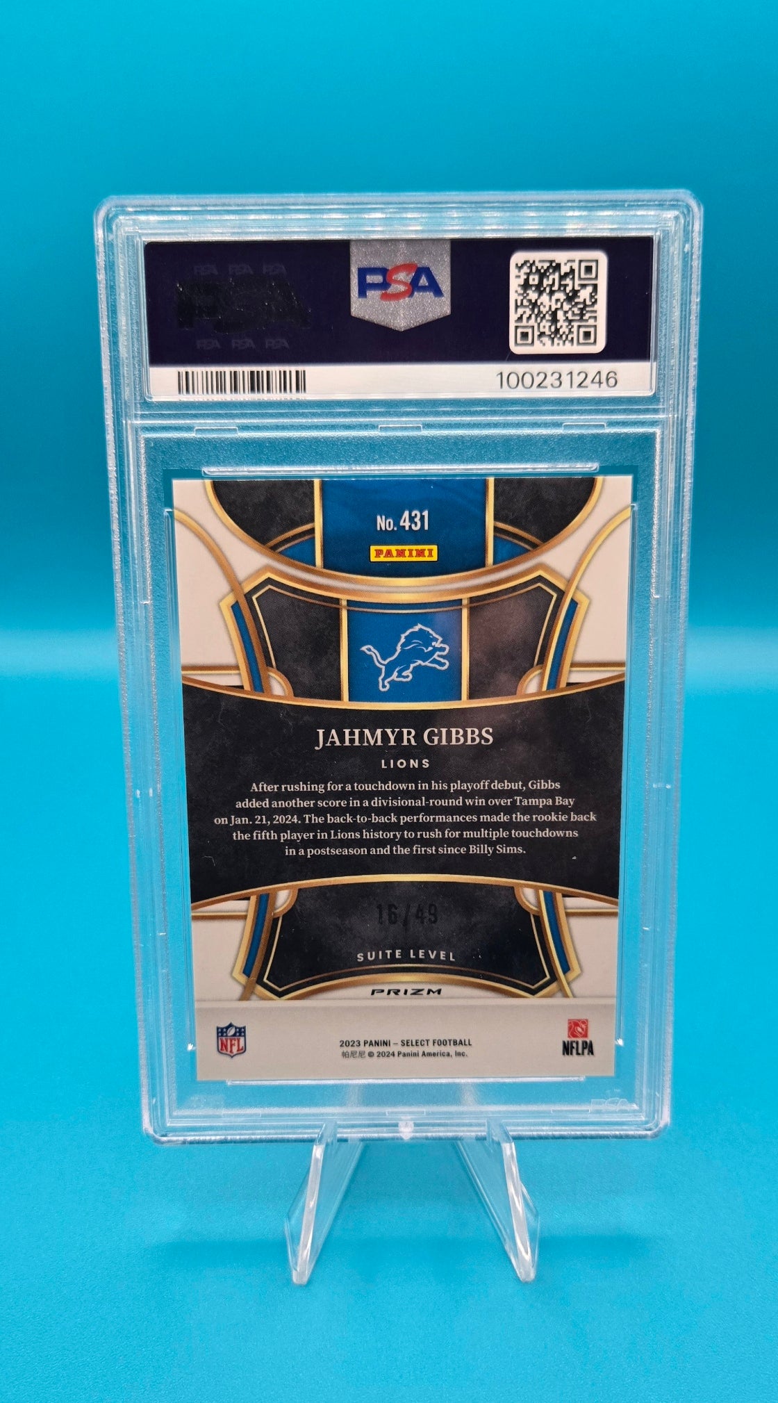 Own the prized 2023 Select Prizm Red #431 Jahmyr Gibbs card, graded PSA 10 for flawless quality 🎯. A must-have for fans of the 🦁 Lions, this card combines rarity and pristine condition. Add this shining gem to your collection and score big! 🏆